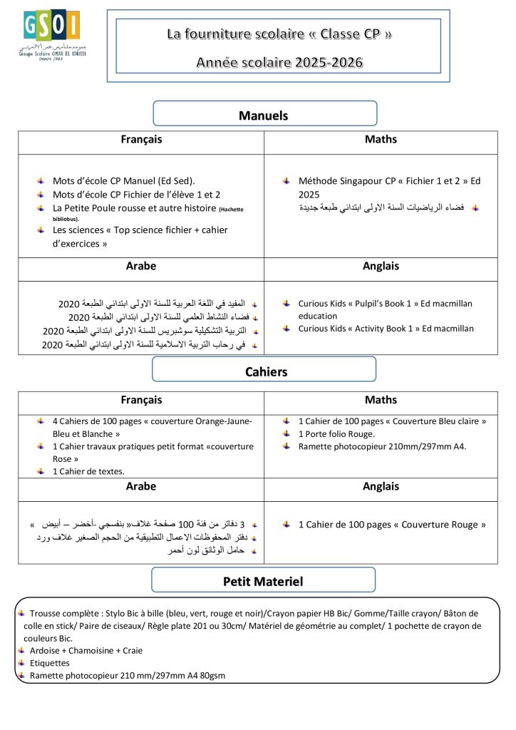 Groupe Scolaire Omar El Idrissi > Blog > Vie Scolaire & Partenariat > Liste des fourniture > Fourniture CP